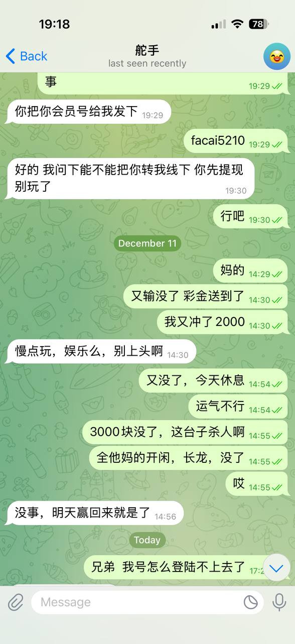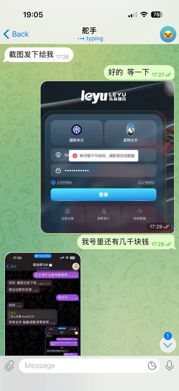 2025.12.10日 之前在迪拜上班认识的一个朋友说是要做代理,让我去他线下玩,说是我输的钱给我百分之55负盈利,赢的钱是我自己的。我想着本来自己平常没事也爱小赌几把,这样也好,就相信他,在他线下注册了账号,而且我也没想着要彩金什么的,能送了送,不送也无所谓,刚开始输钱什么都没事,今天好不容易遇到长龙赢了点钱,提现半天都不到账,我想着提现慢可能,结果过了一会在上号就显示账号不可用,联系客服以及那个傻逼代理,麻痹的和傻逼一样,半天也说不出来为什么,反正就是说我违规投注,我TMD想不没明白,就因为老子玩百家乐开免佣模式就违规投注了吗?乐鱼应该是亚博旗下的台子吧,真的垃圾。多余的话不想说了,奉劝大家平时喜欢小赌几把的朋友千万别去亚博旗下台子去玩,黑的不要不要的,输了还好说,赢了TMD就封号,说你违规投注,我TMD要是刷彩金或者刷什么反水,你直接拿出证据啊,在那里和我扯淡,虽然就几千块钱,但是对于我来说也是一个月工资了,老子国内上班一个月也才8000块,黑台子